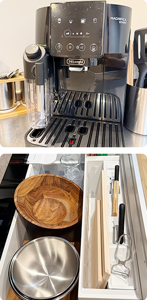 - Full equipped Kitchen, oven, rice cooker, coffee machine, dish washer, refrigerator, freezer, dishes, glasses, cookware