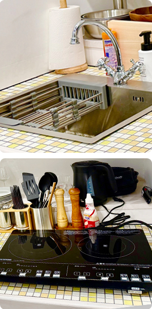 • Full equipped Kitchen, oven, rice cooker, refrigerator, freezer, dishes, glasses, cookware