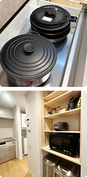 - Full equipped Kitchen, oven, rice cooker, coffee machine, dish washer, refrigerator, freezer, dishes, glasses, cookware